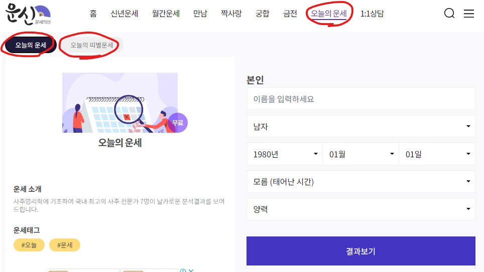 늘의 운세와 오늘의 띠별운세를 볼 수 있습니다. 태어난 시간을 몰라도 내용을 볼 수 있는 장점이 있습니다.
